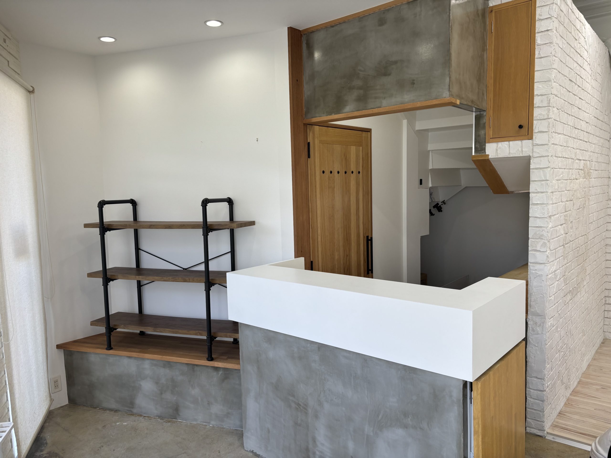沖縄県浦添市のてだこ写真館の内装リフォーム。元々壁がクロス貼りだった箇所をモルタル造形でアジのある白レンガに仕上げました。スタジオの雰囲気がガラッと変わり、床も木材を張って素敵な内装になりました。カウンターもコンクリート調にしました。