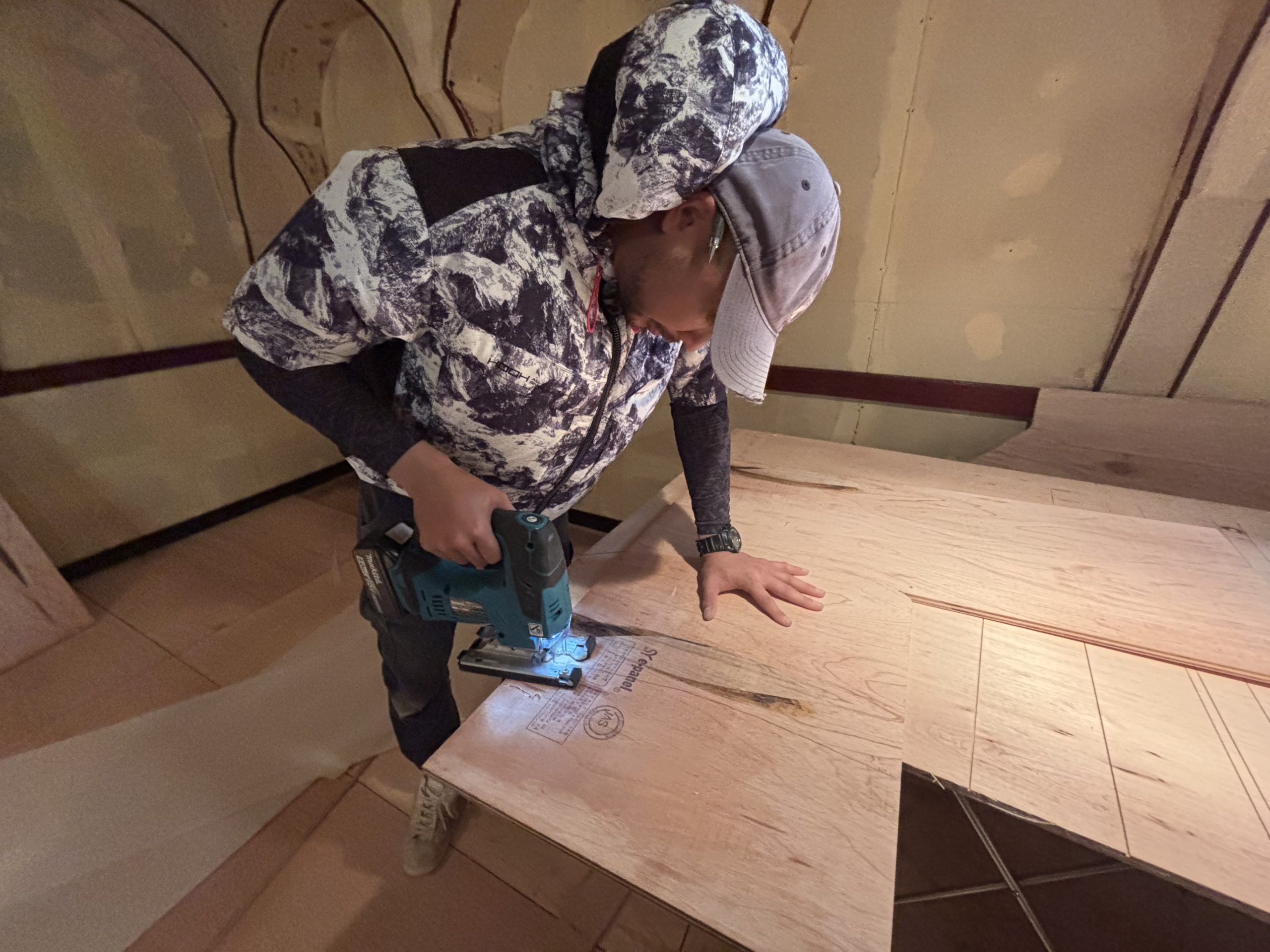 那覇市の飲食店ビルの内装工事。解体やクロス剥がしも終わったので床のベニヤ張り。ジクソーでアールに加工中