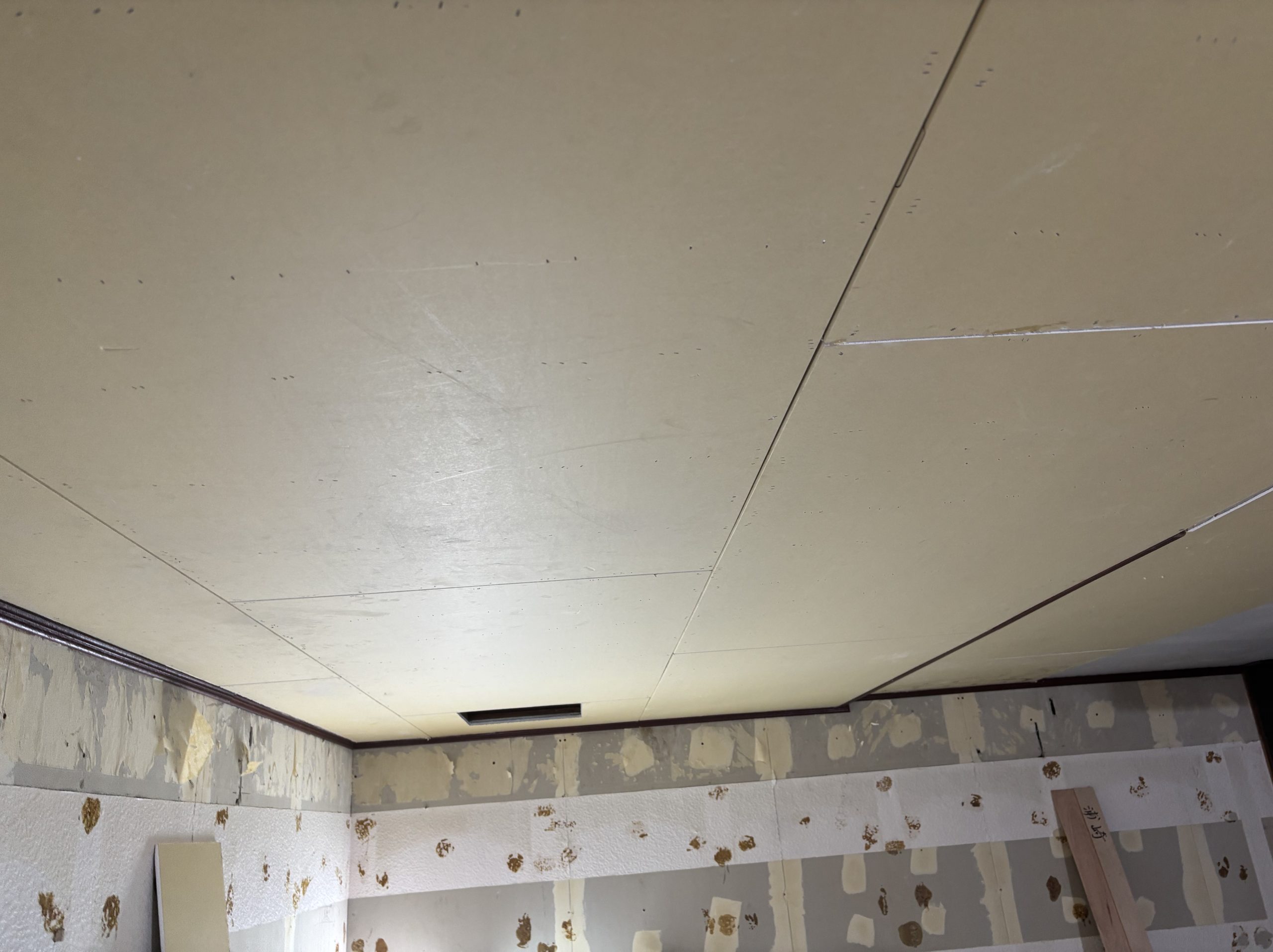 沖縄県那覇市の飲食店ビルの内装工事中です。床の下地工事が完了したので天井下地工事をしてます。天井の仕上げはクロスです。天井下地が終わったら壁に入ります。