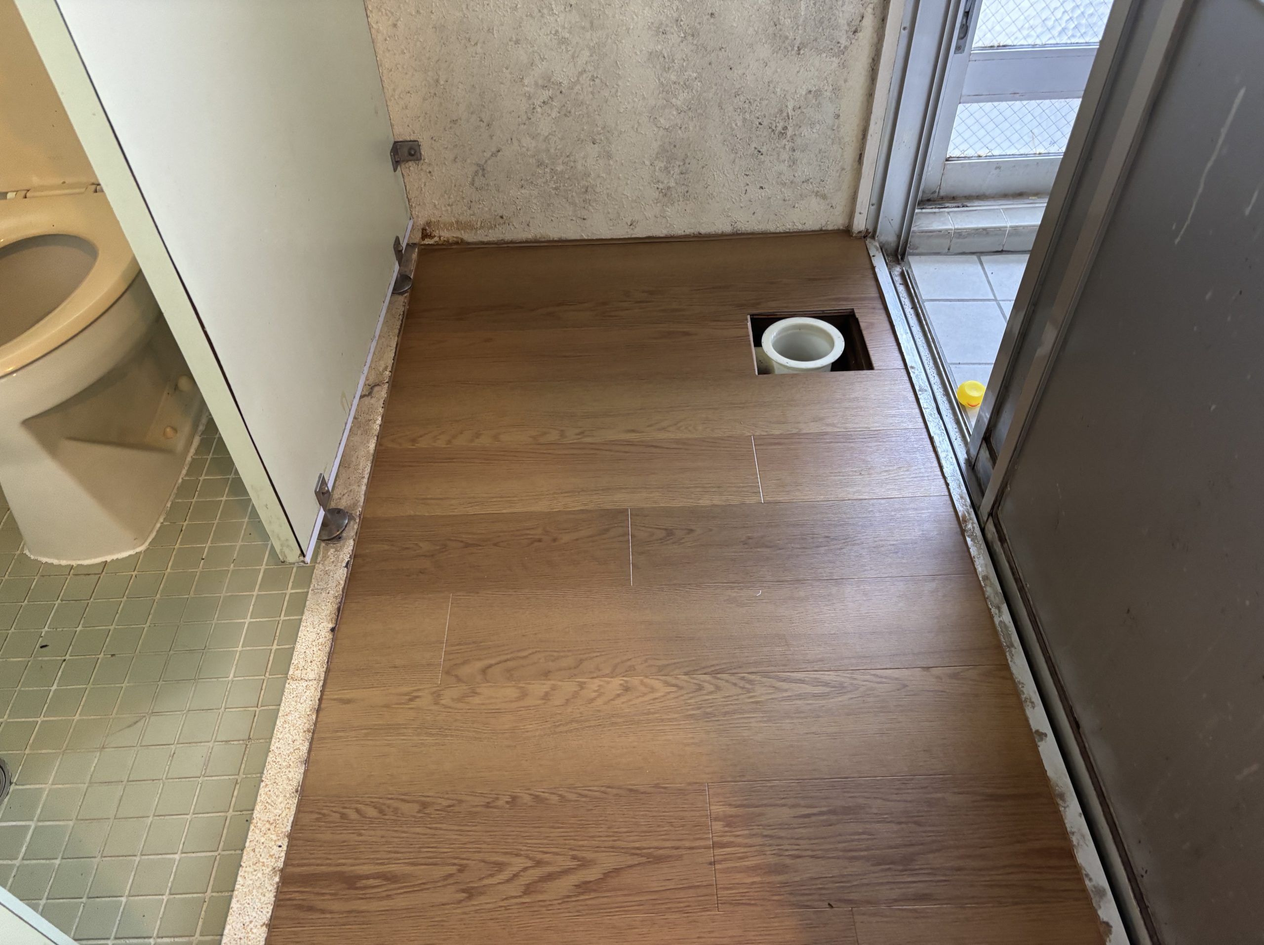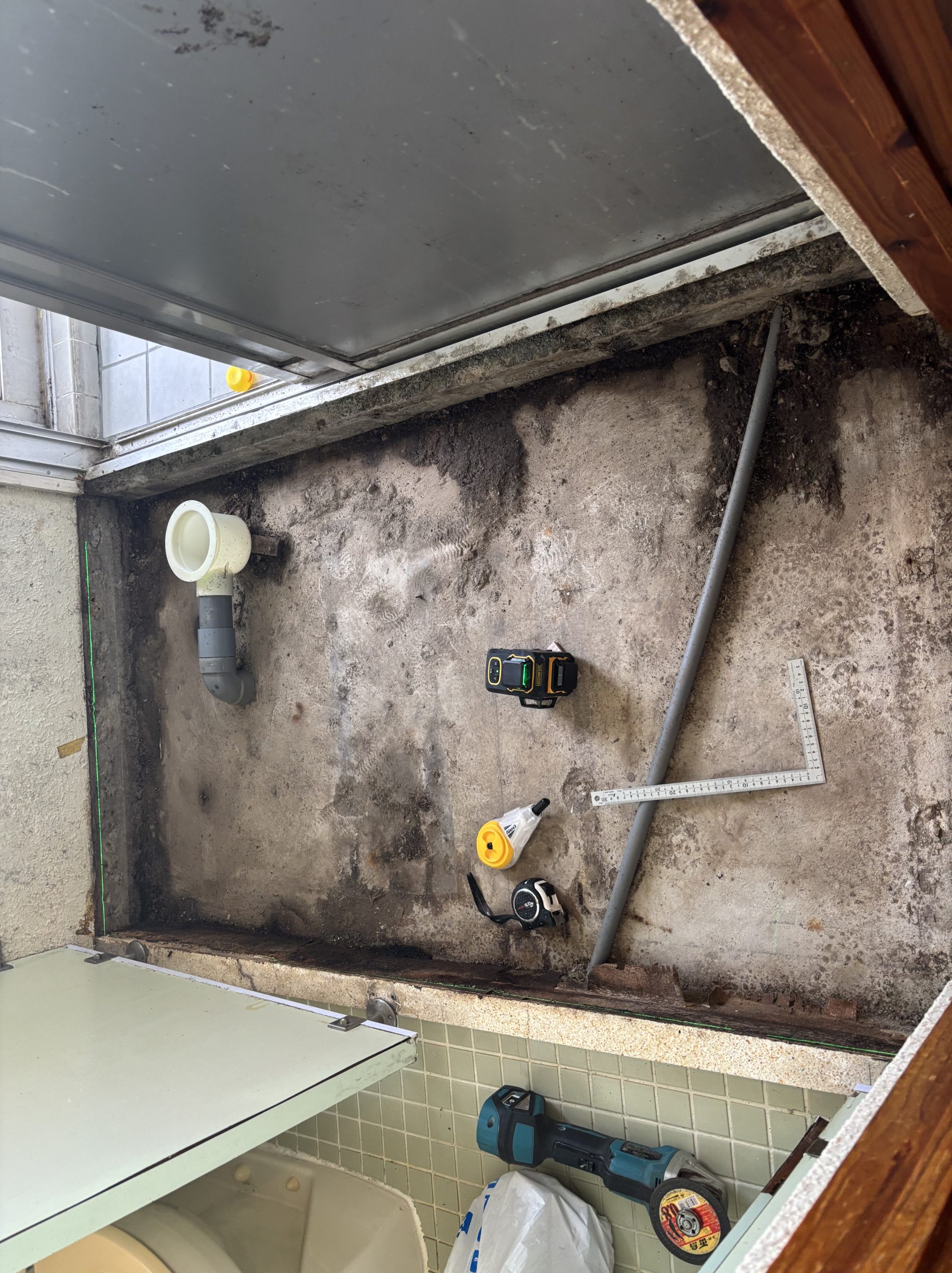 沖縄県浦添市の賃貸アパートの床張り替え工事。洗濯バンと浴室の土間からの水漏れが原因で床が穴あきそうでした。浴室のタイルをハツって防水層からやり替えて、洗濯パンはトラップの劣化で逆流してたので取替、床下をしっかり乾かして、床下地を組み直して塩ビタイル貼りで仕上げました。
