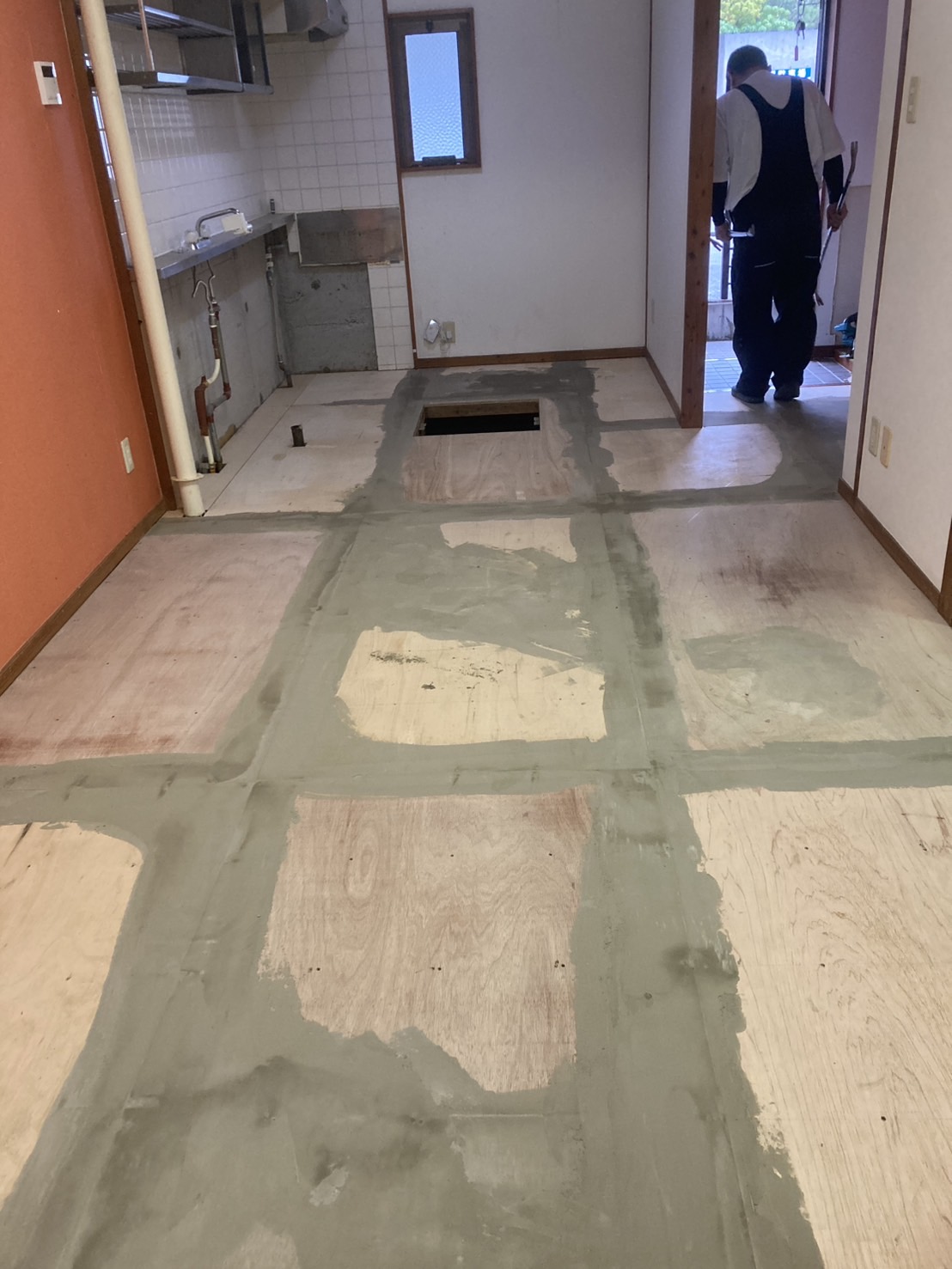 那覇市の分譲マンションのリビング床張り替え。フローリング剥がしてベニヤ捨て張り、仕上げは塩ビタイル貼りです。