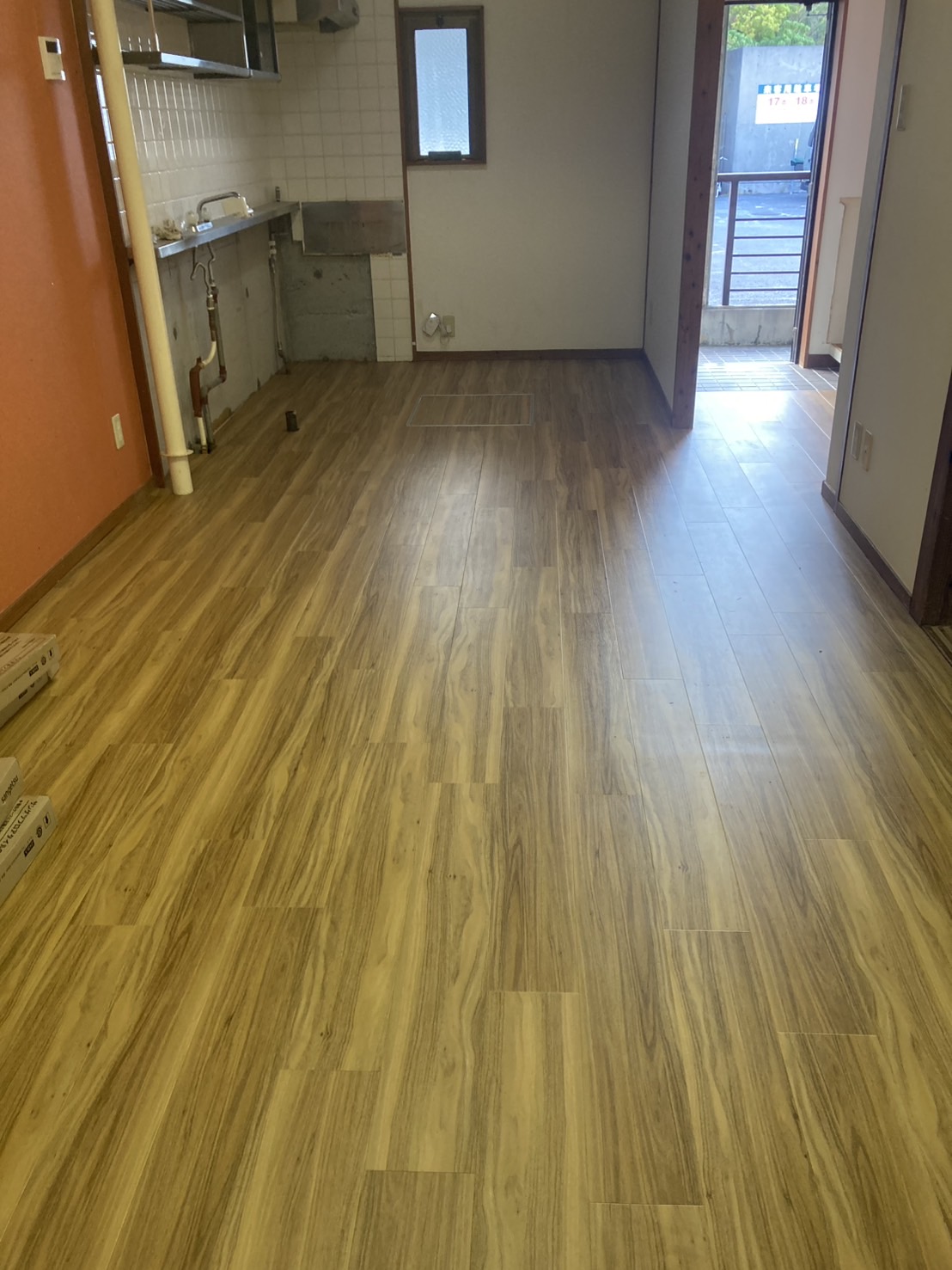 那覇市のマンション床の張り替え完了です。フローリングが弱ってたので解体してベニヤ捨て張りして塩ビタイル貼りしました。